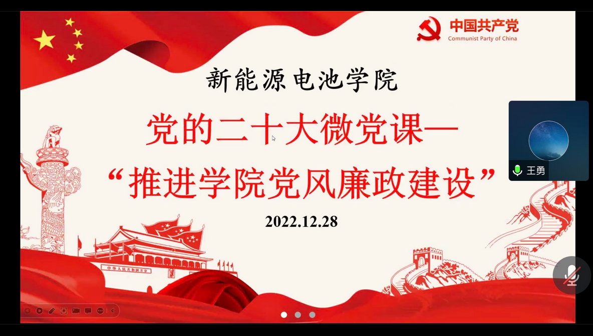 为深入学习贯彻落实党的二十大精神,把握二十大报告的深刻内涵、精神实质和实践要求,贯彻落实好学院党风廉政建设和反腐败工作。12月28日,新能源电池学院党总支进行了“学习党的二十大,推进学院党风廉政建设”的微党课学习。微党课领学人为新能源电池学院党总支纪检委员王勇同志。新能源电池学院全体党员教师、党员学生、发展对象、入党积极分子代表参加此次主题学习。受疫情影响,本次学习线上进行。