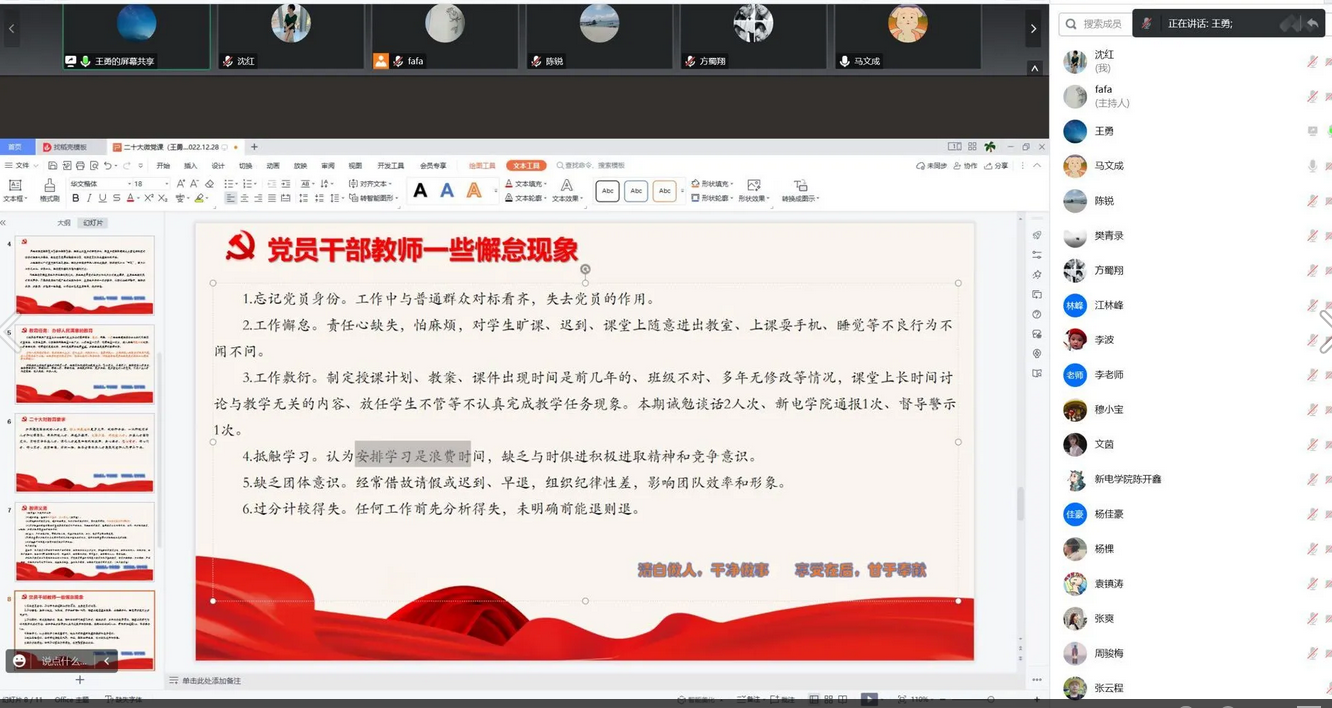 王勇同志首先带领大家学习了二十大原文中关于“全面从严治党”的七个方面的要求,以及二十大对于教育的相关要求。他指出,学院要强化党风廉政建设,反腐败建设,无论是领导干部还是普通党员,都要有服务意识,遵守纪律,不断加强作风建设,完善作风改进,服务好广大师生。王勇同志结合自己的实际工作,指出了部分党员干部教师在日常教学工作中存在的一些懈怠现象,并希望各位党员干部教师能够做到廉洁自律、严于律己、教书育人、关爱学生,积极奉献社会。