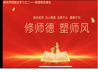 总支书记沈红同志从什么是师德、为什么要加强师德学习、怎样做才能加强师德师风建设三个方面展开,阐述了师德师风的重要性和必要性。她指出,“师爱”是教师对学生无私地爱,它是师德的核心,即“师魂”,作为一名教师应该有“师爱为魂,学高为师,身正为范”的品行修养。此外,沈红同志还解读了《新时代高校职业教育行为十项准则》;展示了违反师德师风的典型现象;对于加强和改进新时代师德师风建设提出了几点意见。