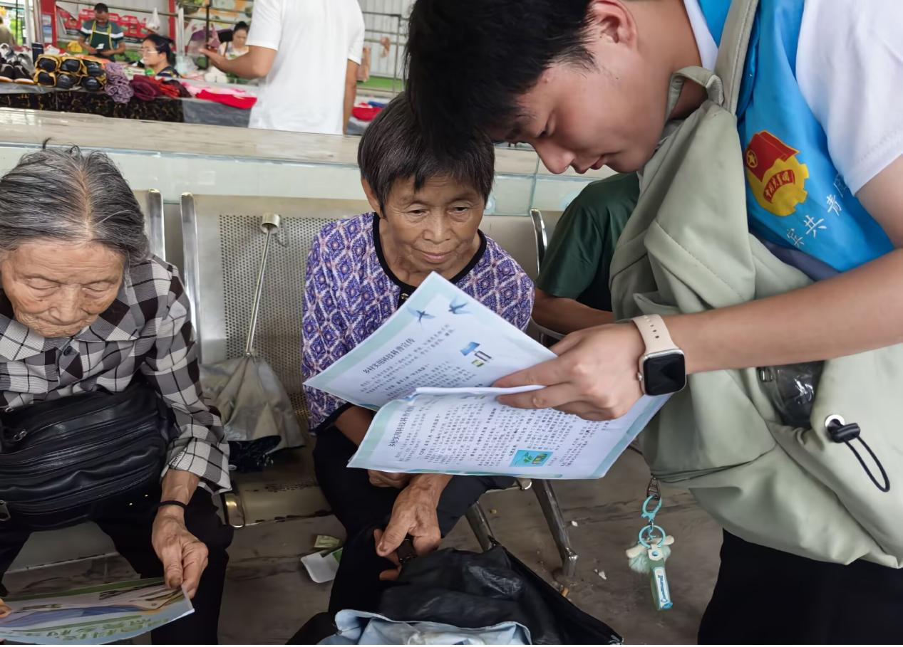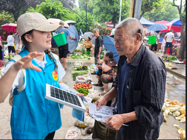 在江南镇上,团队成员利用赶集的日子面向当地群众开展光伏技术、新能源电池技术推广宣传。