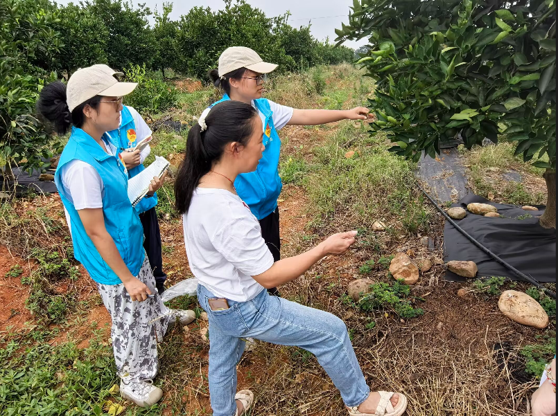 在新塔村塔罗科血橙基地,团队成员对基地化肥、农药、农膜使用以及水肥一体化管网、土壤情况展开实地调研,结合专业知识,对化肥、农药种类、用量以及存在问题进行了科普,同时还就测土配方施肥、低毒农药及可降解地膜推广科学施用技术进行了讲解。