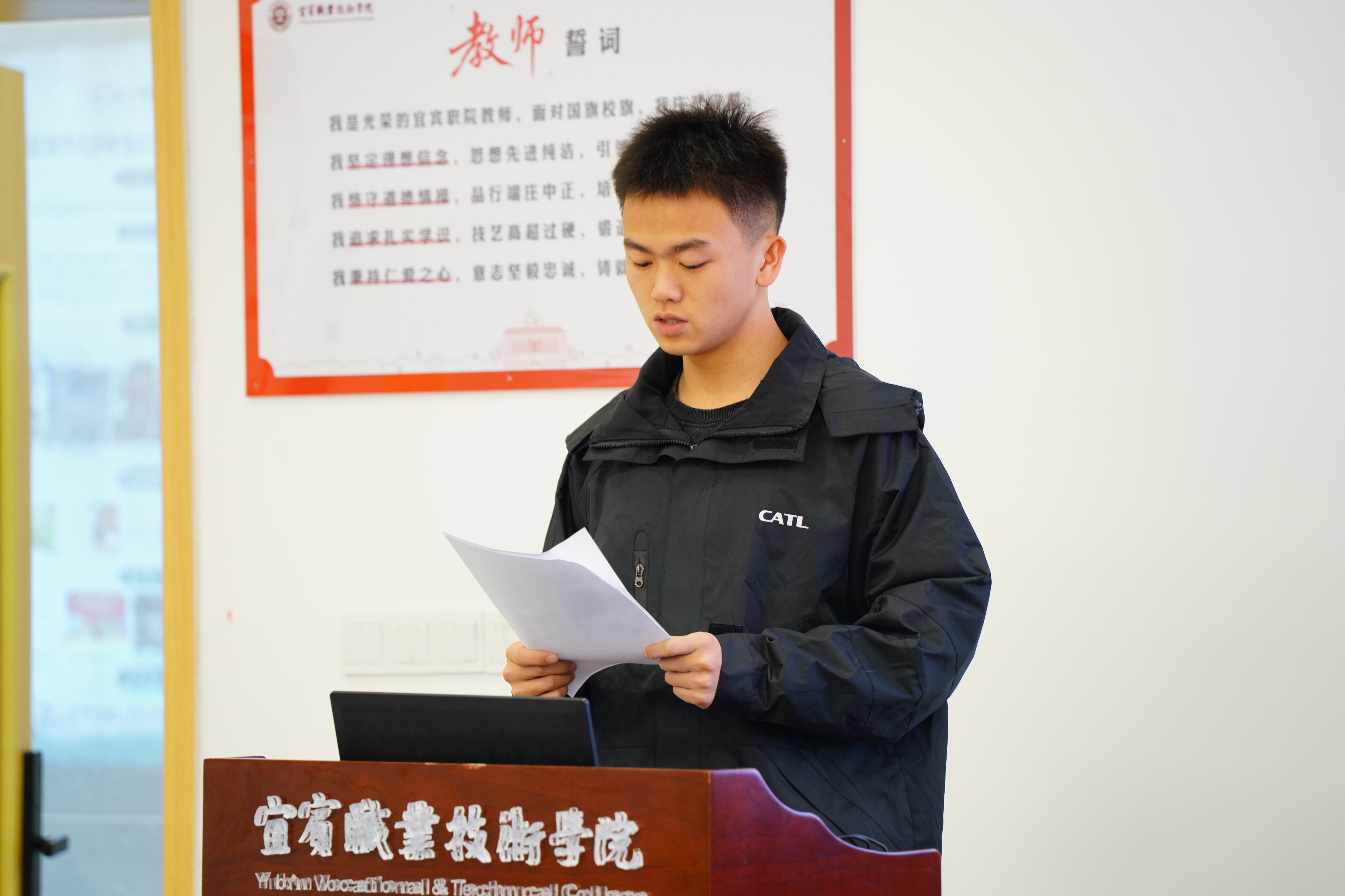 学生代表蔡松波在发言中表达了对学院和宁德时代的感激之情,并代表全体订单班同学郑重承诺:将珍惜这次宝贵的学习机会,深耕专业领域,主动对接企业需求,传承企业精神,为动力电池行业的发展贡献青春力量。
