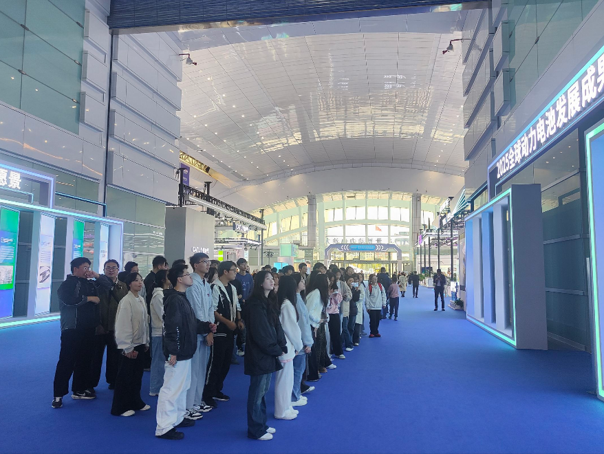 拓宽专业视野、感知产业前沿、深化专业认知, 11 月 13 日下午,新能源电池学院(简称 “新电学院”)第四期青马工程骨干班 80 名学员,在余婷婷老师带领下赴宜宾国际会展中心,参观“2025 动力电池应用生态展览会”,近距离触摸新能源产业发展脉搏。