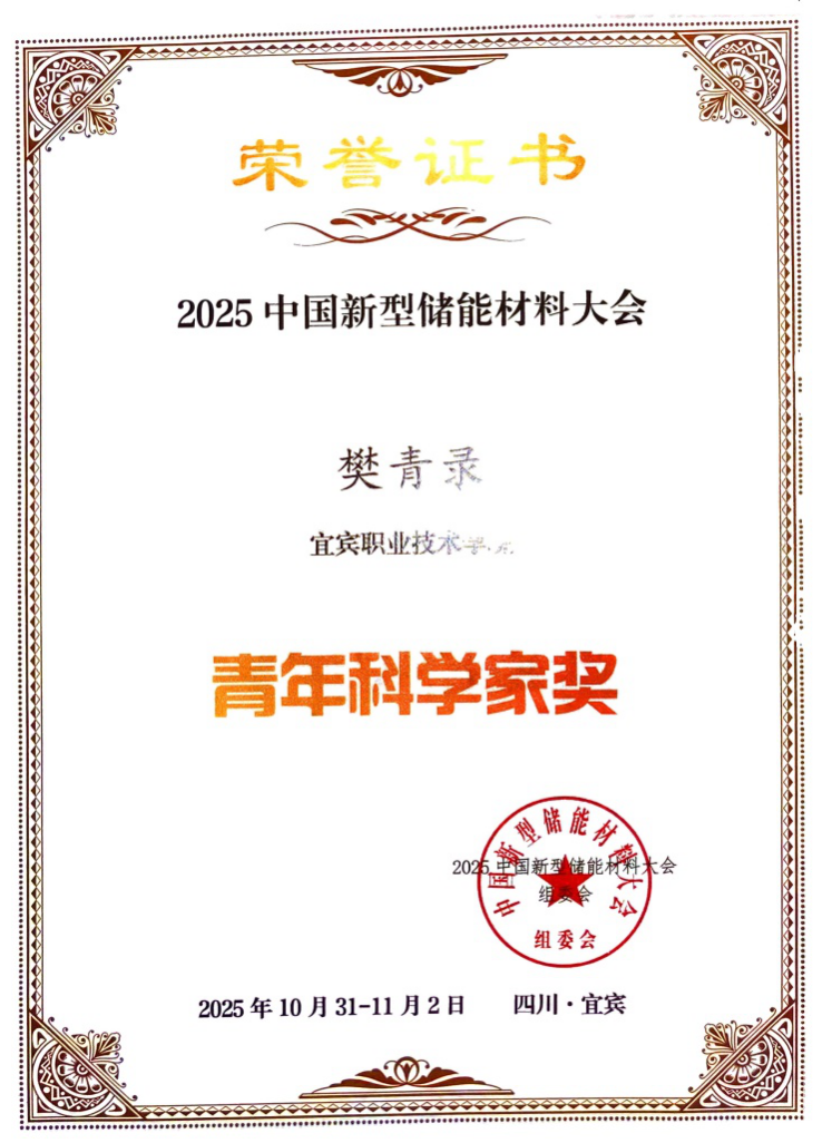 2025年10月31日至11月2日,2025中国新型储能材料大会在宜宾市隆重举行。我院樊青录博士凭借在储能材料领域的技术创新和校企融合实践成果,荣获大会"青年科学家"荣誉称号,并受邀上台领奖。
