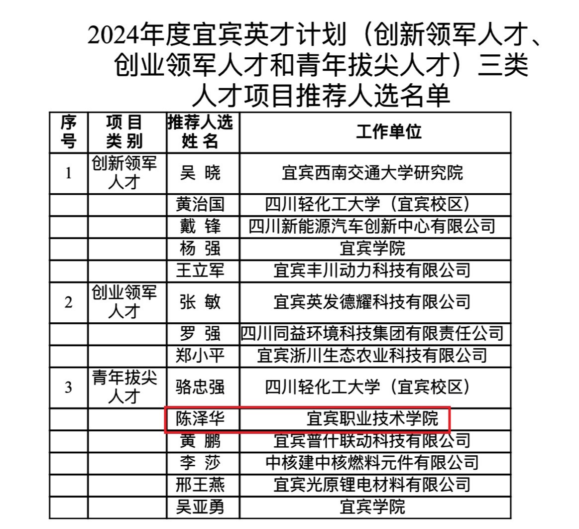 近日,根据中共宜宾市委人才工作领导小组办公室《“宜宾英才计划”实施办法(修订)》(宜委人才领﹝2024﹞1号)和《关于组织开展2024年度“宜宾英才计划”科技领域人才申报推荐工作的通知》等文件精神,市科技局牵头负责科技领域创新领军人才、创业领军人才、青年拔尖人才三类人才项目的组织申报、评审工作,我院陈泽华博士入选2024年度宜宾英才计划三类人才项目中青年拔尖人才推荐人选名单。