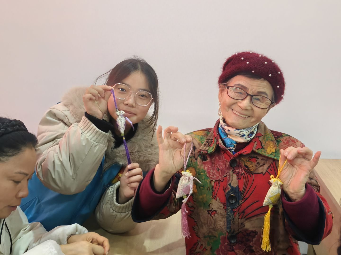 在温馨而热烈的活动氛围中,许多老人满心欢喜地举起他们亲手制作的精美香囊,向周围的朋友和志愿者展示。他们布满皱纹的脸上绽放着灿烂的笑容,眼中闪烁着欣喜,洋溢着满满的成就感与发自内心的幸福感。此次活动不仅让社区居民们深切体验到了动手创作的乐趣和手工制作带来的满足感,更以历史悠久、意蕴丰富的传统香囊文化为情感纽带和载体,进一步增强了邻里之间的互动与交流,为这个寒冷冬日里的社区注入了一股浓厚而持久的温情暖意。