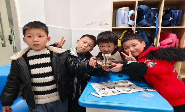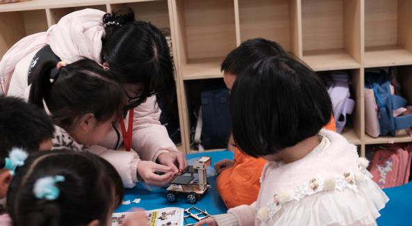 接着马文成博士带领新电学院志愿者进入班级向小学生们展示光伏太阳能小汽车成品,志愿者们为小学生分发太阳能小汽车产品零件,并耐心的讲解使用说明,通过动手制作光伏太阳能小汽车产品,激发小学生对光伏科技的兴趣、使用绿色能源保护生态的意识、探索科学知识的内在动力。